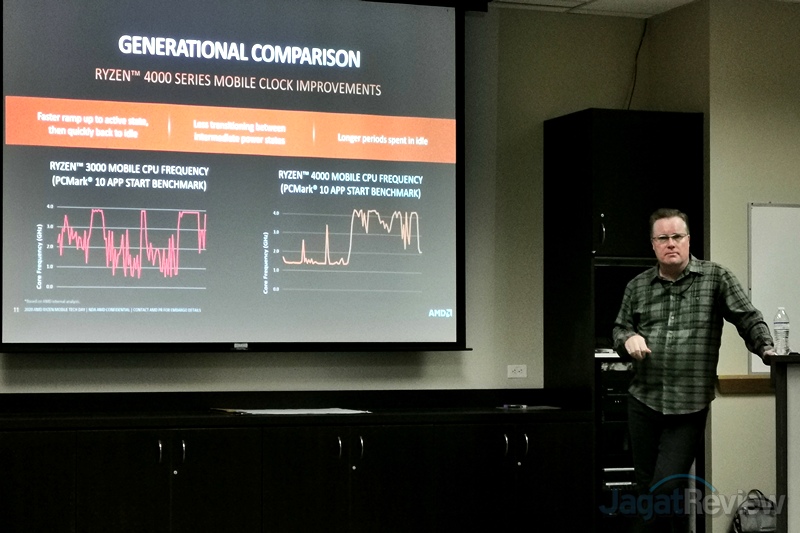 Ryzen Mobile 4000 Series ini juga disebut AMD menawarkan respon yang lebih baik, yang salah satunya disebabkan karena kontrol clock yang lebih cepat dan akurat. Saat ada beban kerja yang membutuhkan prosesor bekerja di clock tinggi, SoC Renoir ini akan langsung beralih ke clock tinggi dengan cepat, yang diharapkan membuat pekerjaan bisa diselesaikan lebih cepat, sehingga prosesor bisa kembali ke dalam kondisi idle dengan lebih cepat. Hal ini akan membuat efisiensi kerja makin baik, yang berimbas ke penggunaan daya yang relatif lebih hemat.