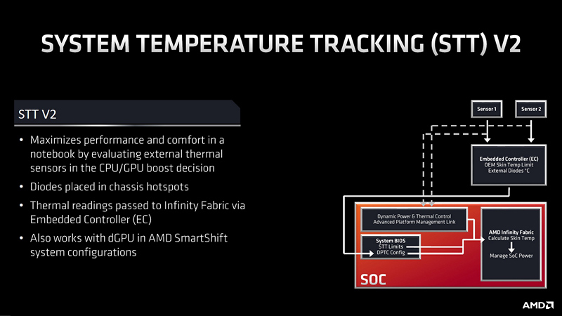 STT V2 ini bekerja sama dengan STAPM dalam pengaturan boost yang lebih baik. Memanfaatkan STT V2 ini, durasi boost bisa lebih panjang, sesuai dengan kondisi skin temperature. Menariknya, untuk SoC Renoir ini, controller untuk menerima data dari sensor sudah terintegrasi di SoC, sehingga disebut AMD sebagai embedded controller, tidak lagi membutuhkan controller tambahan di luar SoC.