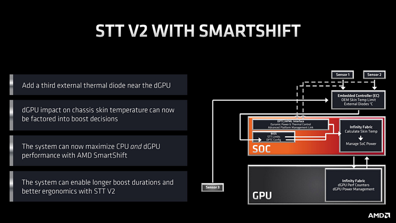 AMD SmartShift ini juga bisa bekerja bersama dengan STT V2, untuk mendapatkan boost GPU diskrit tetapi tidak mengganggu kenyamanan pengguna. Sensor tambahan bisa ditempatkan di area dekat GPU diskrit untuk memantau suhu di sekitar area tersebut dan diintegrasikan ke loop STT V2. Hal ini memungkinkan kontrol performa dengan presisi tinggi, memberikan performa yang relatif lebih tinggi yang disesuaikan dengan suhu, sehingga tidak mengganggu kenyamanan pengguna.