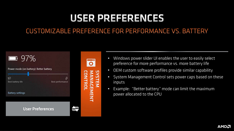 Kontrol performa dari dalam sistem operasi juga disebut ditingkatkan di Renoir ini. Pengguna bisa mengatur apakah laptop akan beroperasi di mode performa tinggi atau mode yang lebih hemat baterai melalui slider yang ada di Windows 10 atau aplikasi besutan produsen laptop. System Management Control di Ryzen Mobile 4000 Series akan mengatur performa maksimal yang bisa diberikan prosesor sesuai pengaturan dari pengguna tersebut, apakah pengguna butuh performa tinggi secara konsisten walaupun laptop tengah tidak terhubung ke sumber listrik, atau justru pengguna butuh daya tahan baterai lebih panjang.