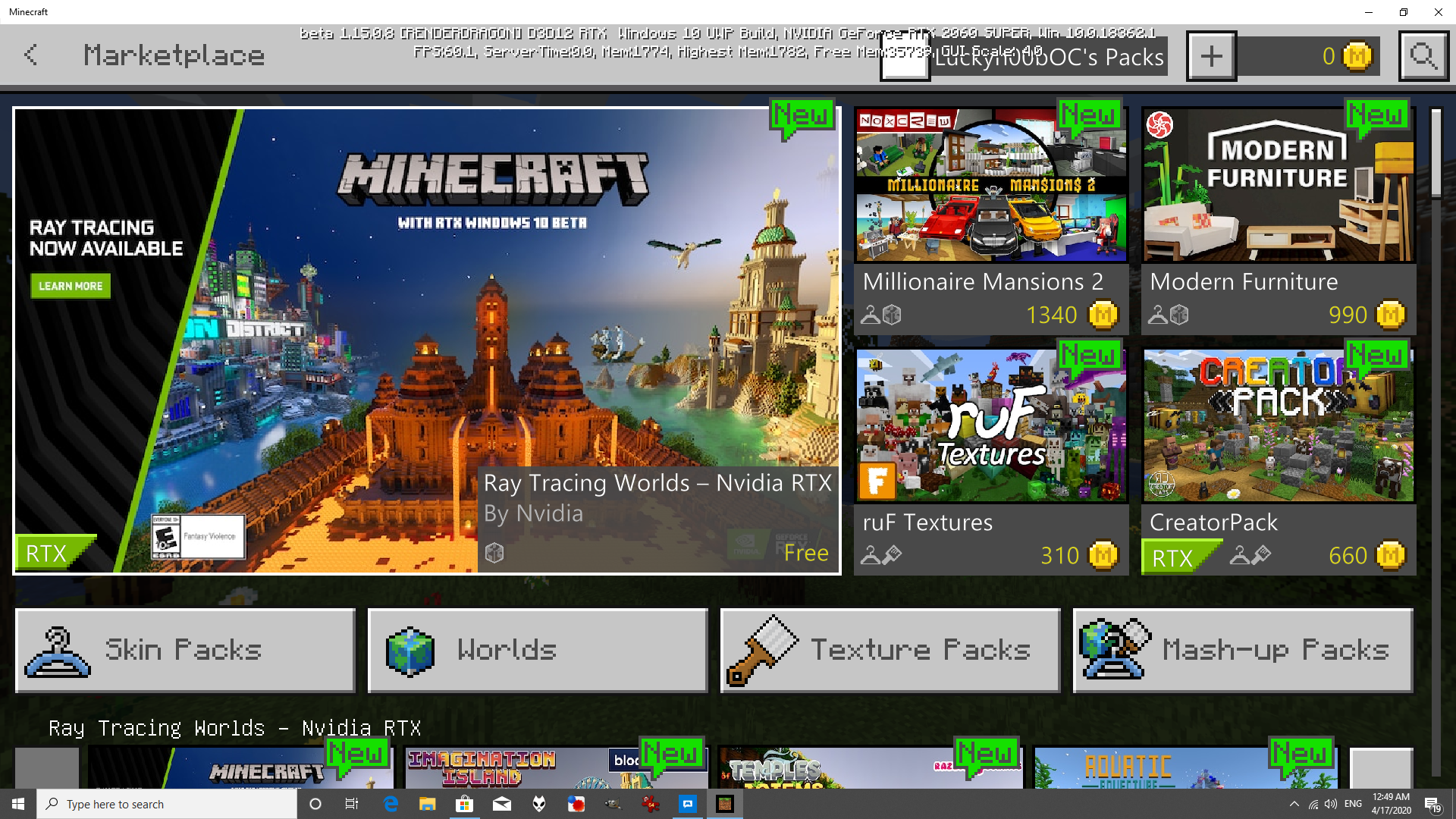 Ray Tracing di Minecraft hanya berjalan pada ‘Ray Tracing Worlds’. Anda bisa memulai Masuk ke Marketplace untuk men-download beberapa Ray Tracing Worlds (tersedia GRATIS)