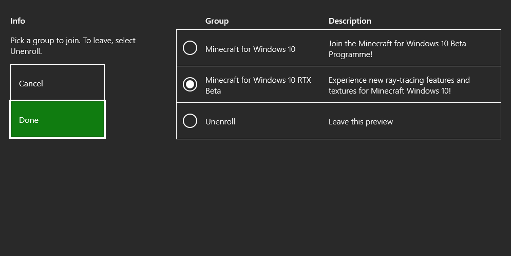 Pilih ‘Minecraft for Windows 10 RTX Beta‘, dan klik ‘Done‘ & Accept .
