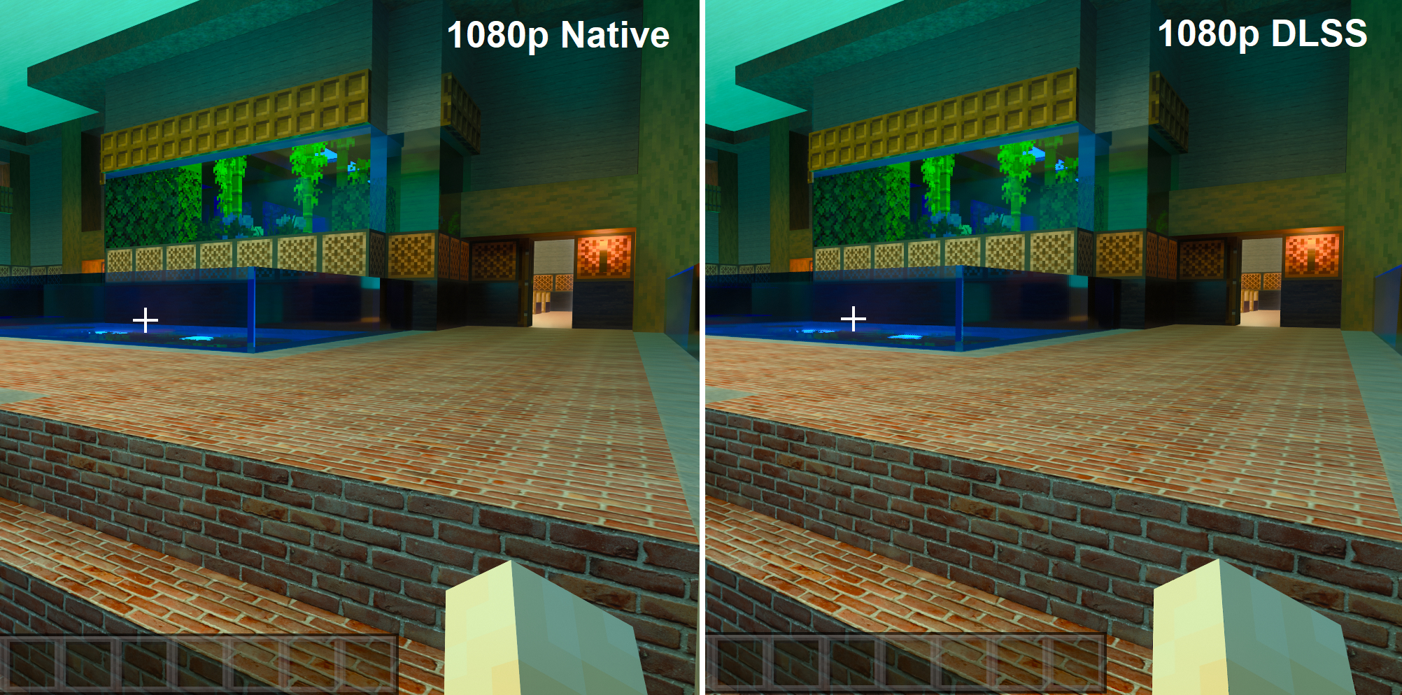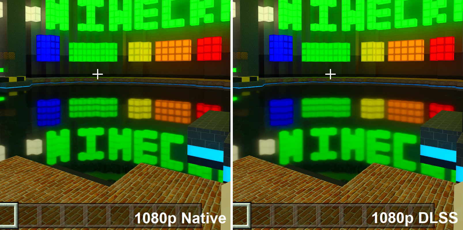 Disini terlihat bahwa DLSS yang pada dasarnya menurunkan resolusi internal dari game-nya, menunjukkan perbedaan performa SANGAT signifikan. DLSS membuat Minecraft RTX yang tadnya hanya ada di sekitar 40 FPS-an pada GeForce RTX 2060, menjadi playable di atas 60 FPS!