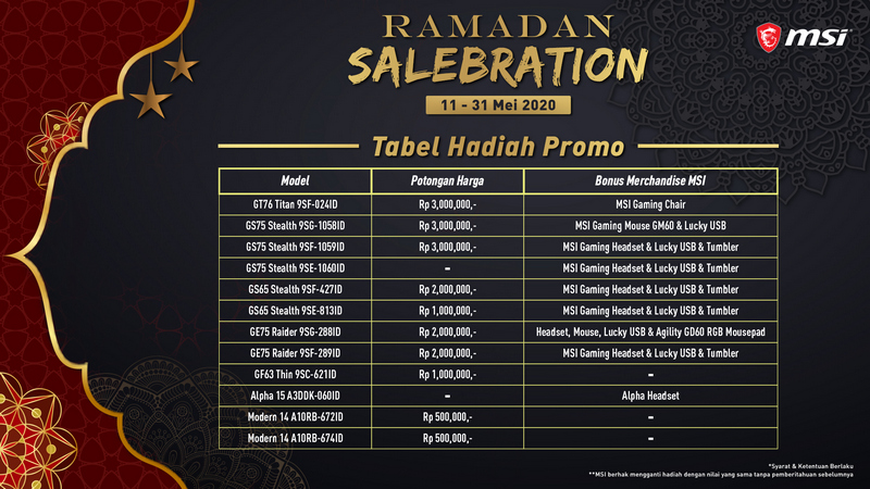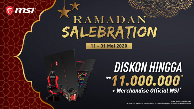 MSI, salah satu produsen laptop dan komponen PC ternama, baru saja mengumumkan Ramadan Salebration. Ini merupakan promosi yang digelar MSI pada 11 – 31 Mei 2020 ini untuk menyambut bulan Ramadan dan Idul Fitri, untuk produk laptop mereka. Pembeli produk laptop MSI di periode tersebut akan mendapatkan potongan harga dan bonus merchandise menarik, serta berpotensi mendapatkan hadiah tambahan yang sudah disiapkan.