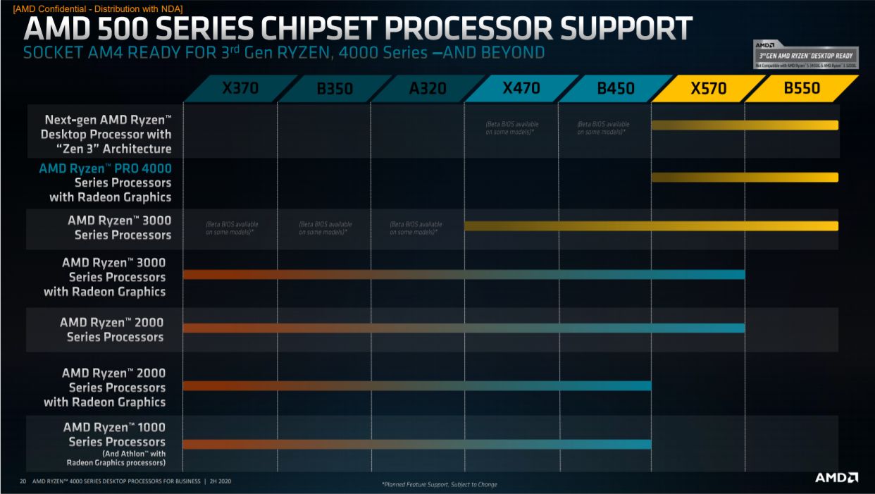 Saat ini, AMD mengatakan bahwa hanya chipset 500-series (B550 & X570) yang akan kompatibel untuk Renoir Desktop, dan belum ada rencana untuk pemberian dukungan pada 300-series dan 400-series chipset.