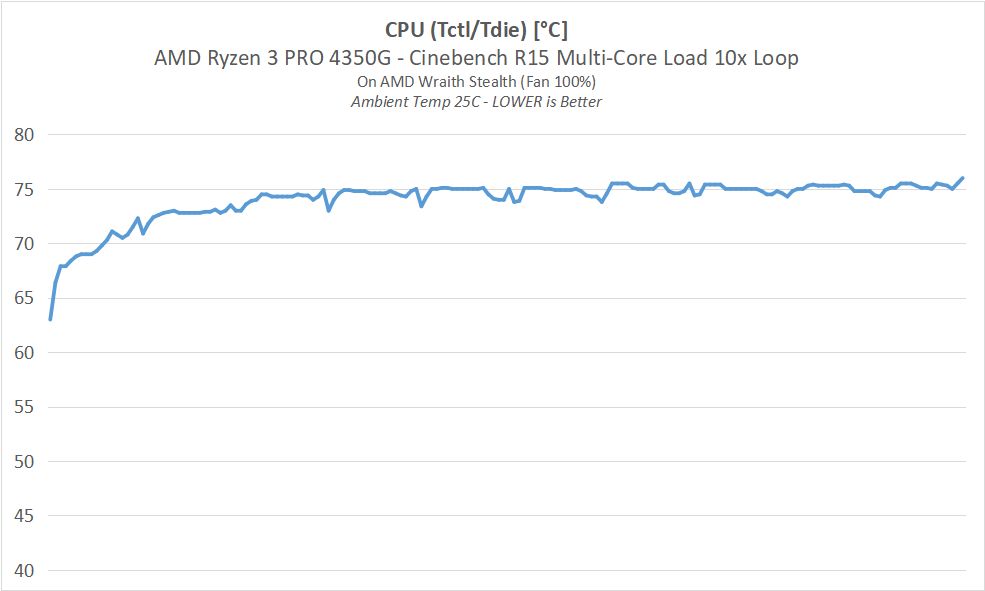 Pada uji stress-test singkat dengan Cinebench R15 10x Loop, APU ini masih terdeteksi memiliki suhu operasi di sekitar 75 C-an, termasuk normal untuk suhu pada cooler bawaan AMD Wraith Stealth.