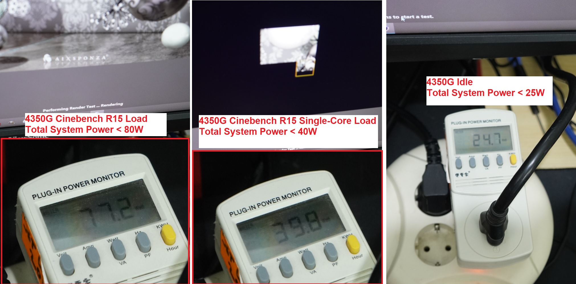 Bahkan saat load 4-core 8-Thread di Cinebench R15 sekalipun, 4350G belum menyentuh 80W.