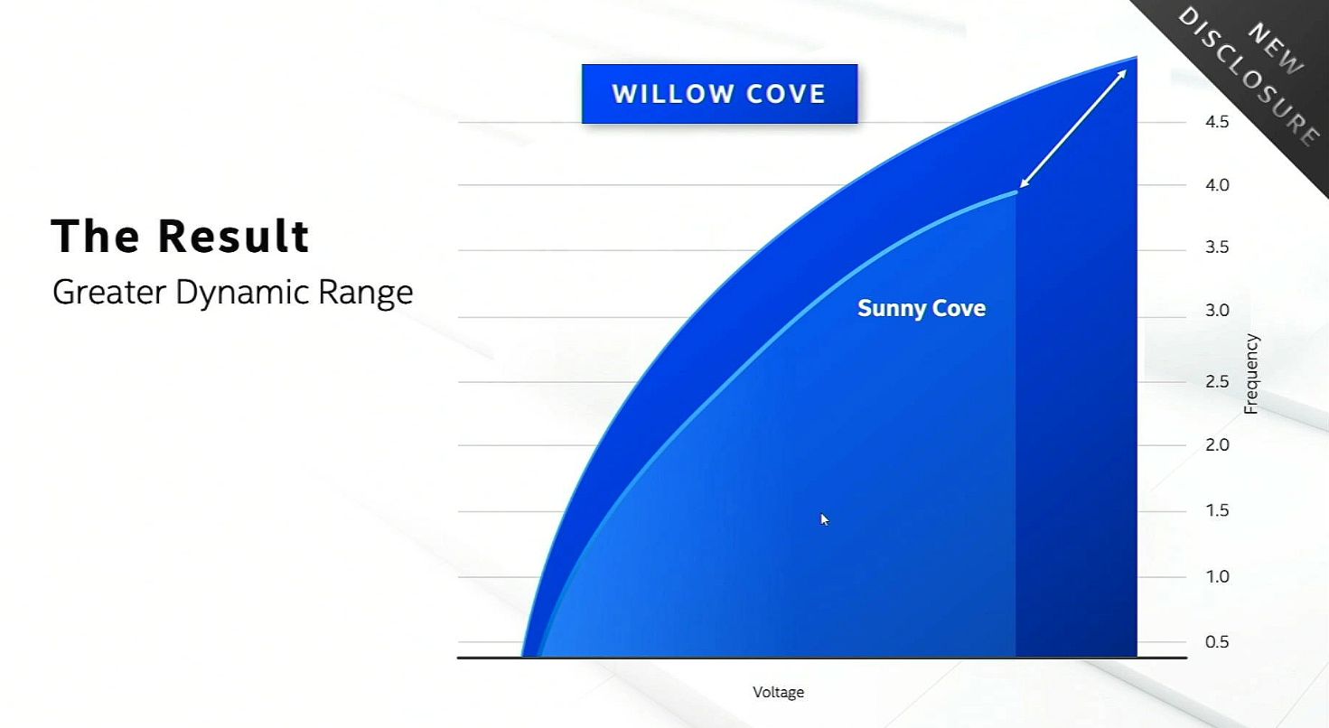 Dari ilustrasi di atas, Tiger Lake CPU(Willow Cove core) dengan dengan 10nm SuperFin menunjukkan clockspeed lebih tinggi dengan voltage rendah, dan sekaligus mengizinkan prosesor tersebut berjalan di range clockspeed tinggi yang tidak bisa dicapai Ice Lake(Sunny Cove Core).