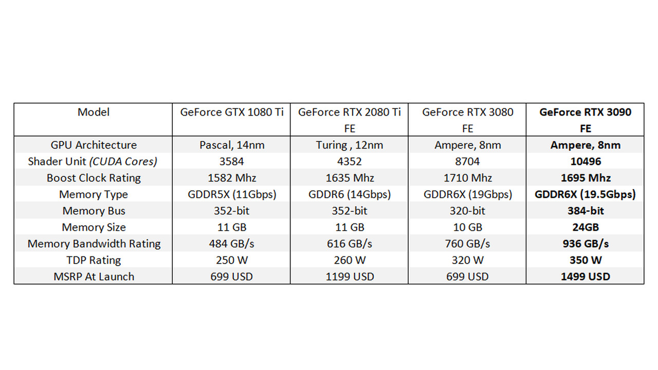 Seperti berbagai GPU NVIDIA lainnya, RTX 3090 akan datang dengan Versi ‘reference’ dari NVIDIA (disebut ‘Founders Edition’), dan juga versi custom dari berbagai AIB(Add-in Board) partner. Versi custom ini biasanya dilengkapi solusi cooling yang lebih baik, dan bisa juga mendapat konfigurasi pre-overclocked dengan boost clock dan Power Limit lebih tinggi.
