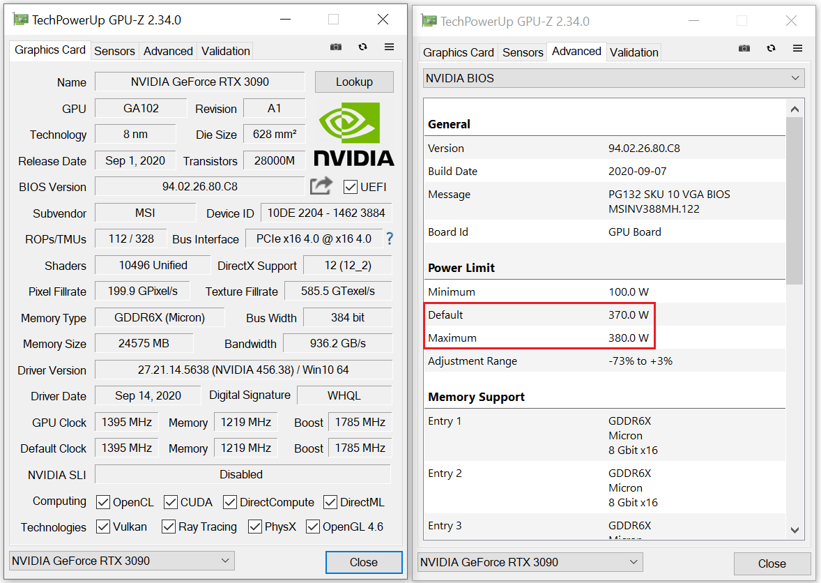 - Power Limit RTX 3090 dari NVIDIA ada di 350W, MSI Gaming X Trio diberikan 370W, dan bisa ditingkatkan ke 380W.