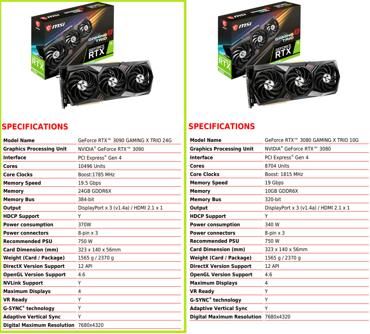 Jumlah shader unit dan juga Rating Memory-nya sama dengan spesifikasi NVIDIA, MSI RTX 3090 Gaming X Trio memiliki 10496 Shader Unit, dan memory-nya menggunakan 24 GB GDDR6X 19.5 Gbps. Chip RTX 3090 dibuat berdasarkan chip GA102, yang dibuat dengan fabrikasi Samsung 8N NVIDIA Custom.