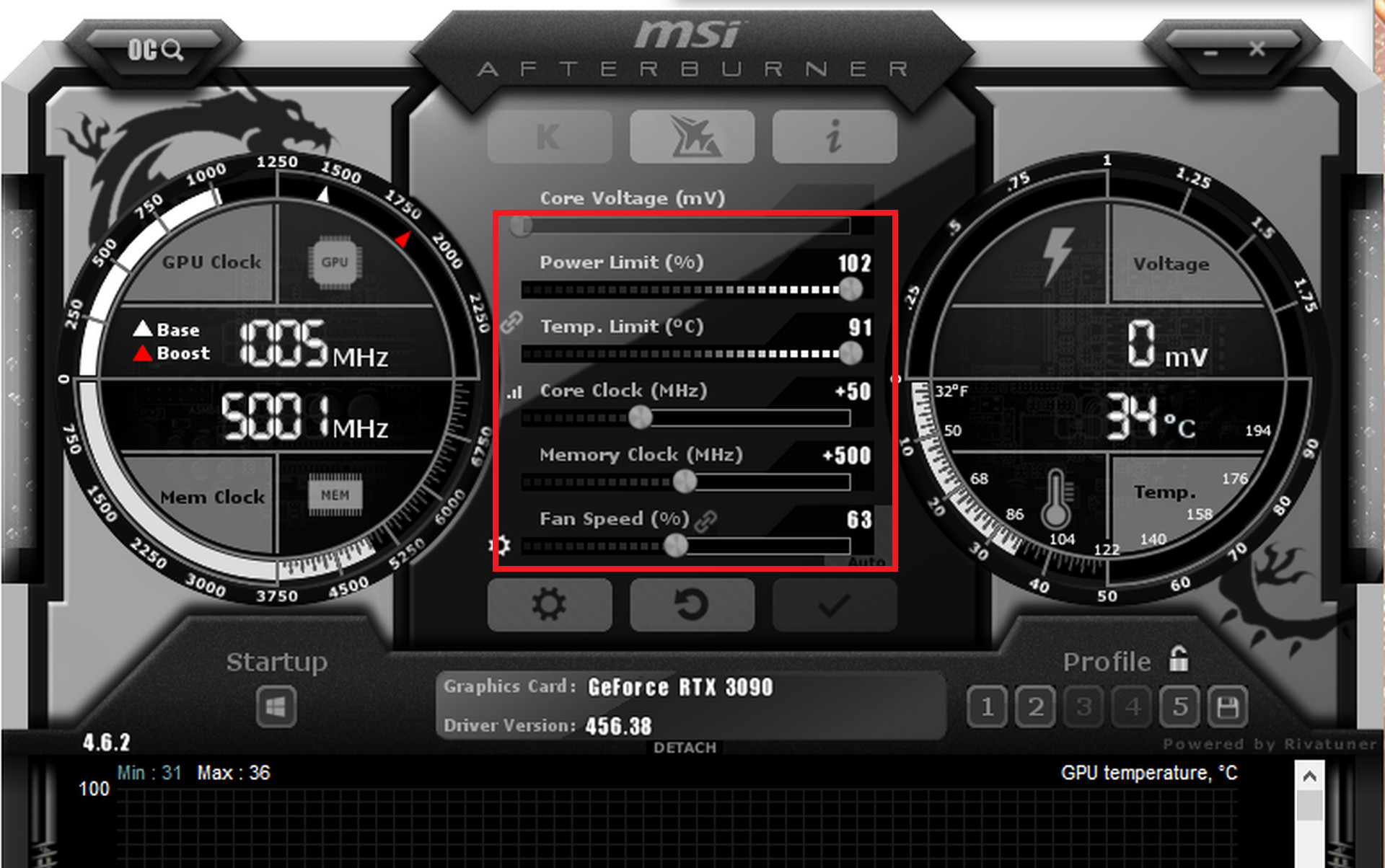 - Memory Clock juga bisa di-offset, hanya saja Anda perlu tahu bahwa nilai penambahannya tidak dilakukan dalam satuan Mhz. Dengan kondisi 1219 Mhz sebagai nilai default GDDR6X (19Gbps), menambahkan nilai Memory clock hingga +500 di sini akan menghasikan clock memory yang naik hanya 62 Mhz saja hingga total menjadi 1281 Mhz (GDDR6X ~ 20.5 Gbps).
