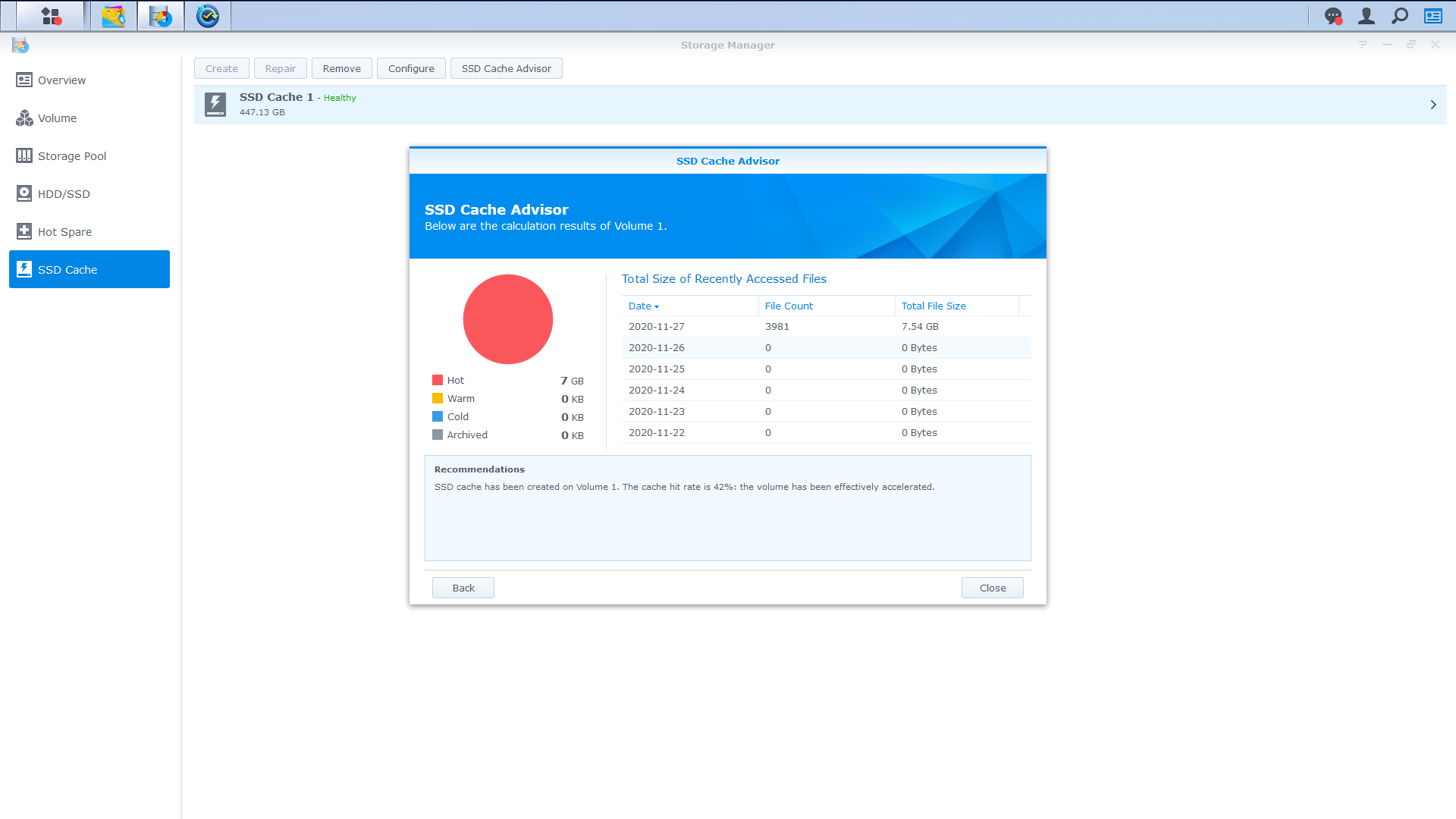 RAID 5 di 3 buah HDD 8 TB membuat kami mendapatkan kapasitas sekitar 16 TB, yang seharusnya bisa dikatakan mencukupi untuk kebutuhan awal di sebuah kantor berukuran kecil. Sementara itu, RAID 5 juga membuat redundansi hingga kerusakan 1 buah storage yang terpasang bisa didapatkan. SSD Cache akan membuat proses restore backup berjalan lebih singkat bila dibandingkan tanpa penggunaan SSD Cache, tentu saja dengan dikombinasikan penggunaan kedua port 1 GbE di mode Link Aggregation, dengan switch/router di jaringan lokal yang tentu saja sudah mendukung Link Aggregation.