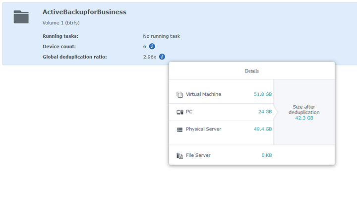 Melihat dari apa yang ditawarkan oleh Active Backup for Business, tentu saja akan banyak yang bertanya-tanya berapa besar storage yang dibutuhkan untuk semua hal itu. Seberapa besar storage yang dibutuhkan tentu saja akan tergantung dari jumlah PC, server fisik, virtual machine, dan file server yang di-backup. Walaupun begitu, perlu diperhatikan, NAS yang mendukung Active Backup for Business juga dilengkapi dengan teknologi yang membuat penggunaan kapasitas penyimpanan data lebih efisien, yaitu global deduplication. Sesuai namanya, fitur ini akan memangkas ukuran backup dengan cara “menghilangkan” duplikasi data. “Menghilangkan” di sini bukan berarti data yang terduplikasi tidak akan dianggap, tapi dengan metode tertentu, NAS akan “memetakan” data terduplikasi ke data yang sama, mengurangi penggunaan kapasitas storage untuk Active Backup for Business, khususnya untuk backup dari PC, server fisik, dan virtual machine.