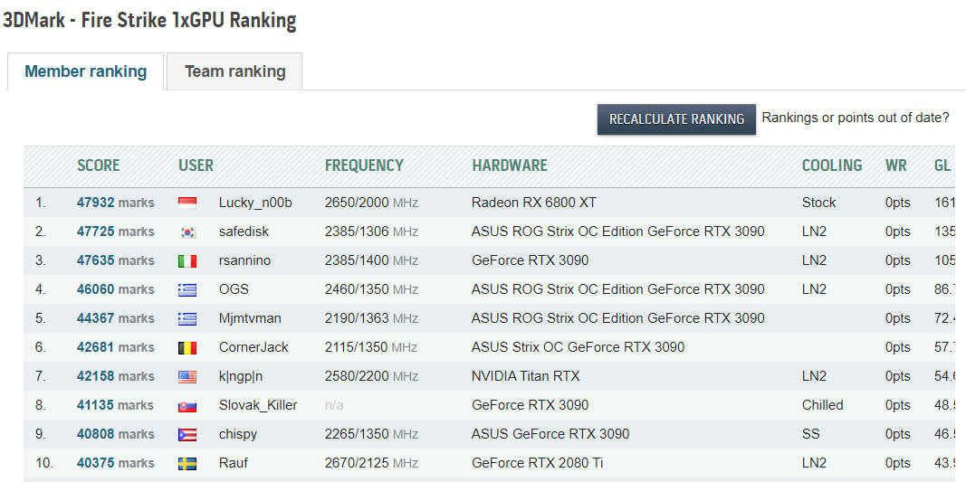 Tidak lupa juga, GPU RX 6800 XT juga menunjukkan potensi performa tinggi pada beberapa skenario spesifik. Ini dibuktikan dengan dirinya sempat menduduki posisi pertama 3DMark Fire Strike Single GPU Ranking di database overclocking HWBOT.org, pada tanggal 18 November 2020 lalu – mengalahkan dominasi GeForce RTX 3090 untuk pertamakalinya !