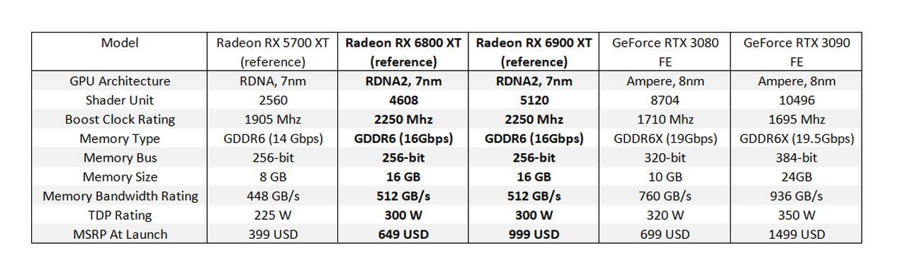 Dilihat sekilas, RX 6800 XT dan RX 6900 XT memiliki perbedaan utama pada pada jumlah Shader Unit, dan segmentasi Harga, sedangkan variabel yang lain sama.