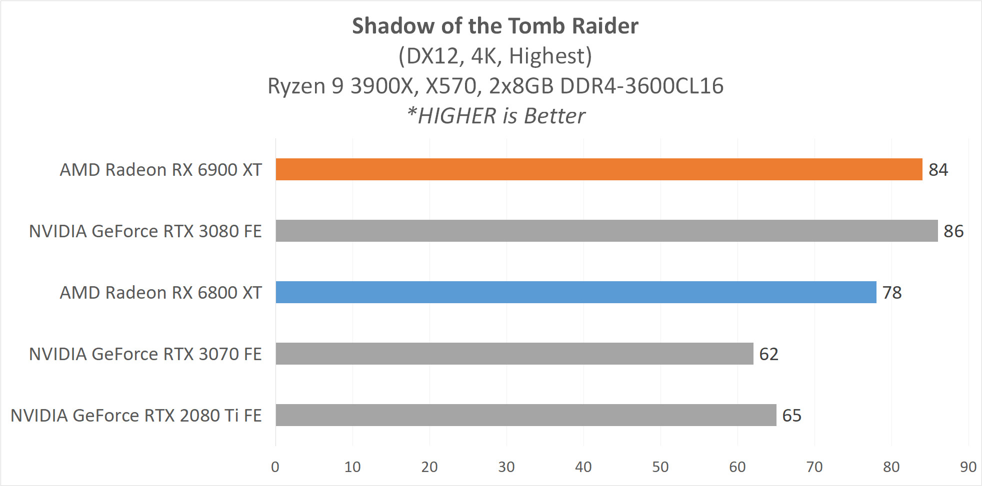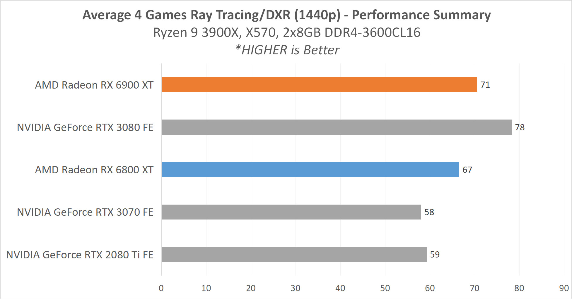 Kedua GPU ‘Big Navi’ ini masih terlihat memiliki performa di bawah GPU NVIDIA ‘Ampere’ RTX 30-series seperti RTX 3080 saat aplikasinya memanfaatkan DirectX Ray Tracing, dan juga NVIDIA masih memiliki senjata utama berupa DLSS, untuk mencapai performa lebih tinggi dengan kualitas image serupa berkat rekonstruksi gambar yang diakselerasi deep learning.
