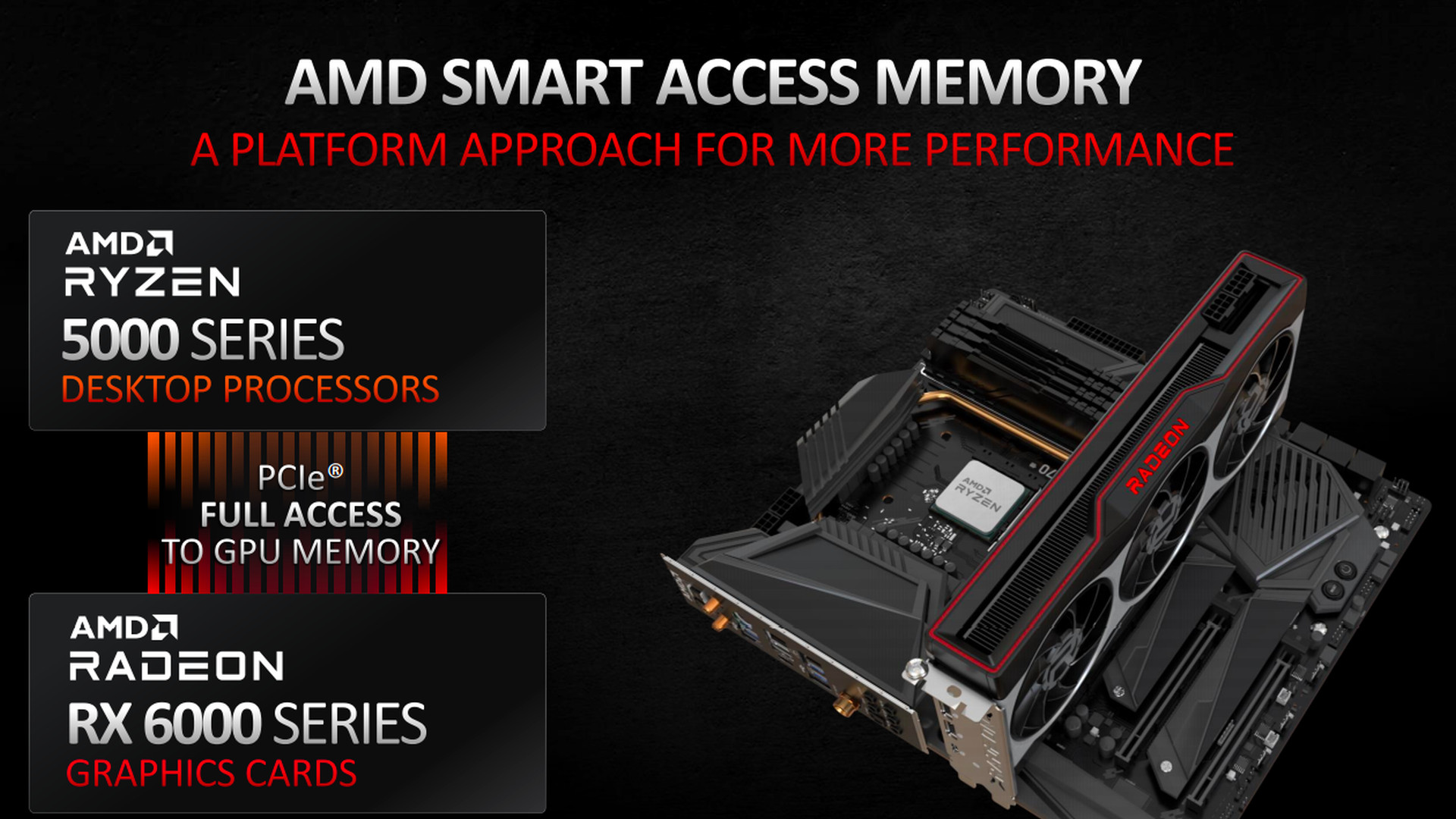 Pada platform AMD Ryzen 5000-series, AMD memiliki sebuah fitur bernama AMD Smart Access Memory(SAM), yang secara teori mengizinkan CPU dan GPU untuk berkomunikasi dengan lebih optimal, dimana CPU dapat memiliki ‘full access to GPU memory‘ (menurut berbagai dokumentasi, biasanya hanya nilai 256MB yang ter-expose ke CPU)