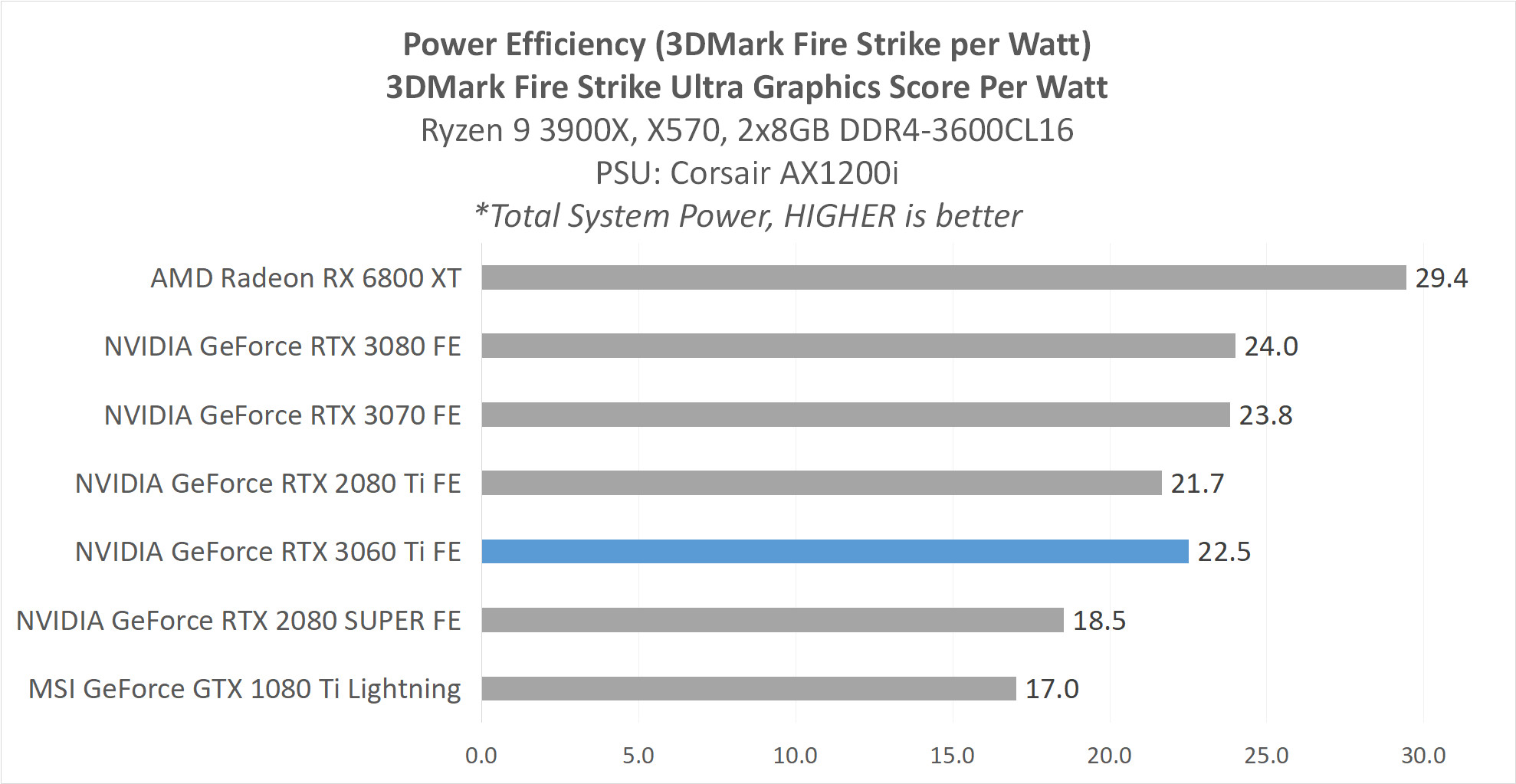 Sesuai dengan rating/kelas TDP-nya di 200W, RTX 3060 Ti menunjukkan konsumsi daya yang cukup rendah, total sistem kami ada di 320W. Meski demikian, efisiensi daya-nya ditinjau dari 3DMark Fire Strike Ultra per watt-nya tidak terlalu jauh beda dari GPU Ampere yang lain.