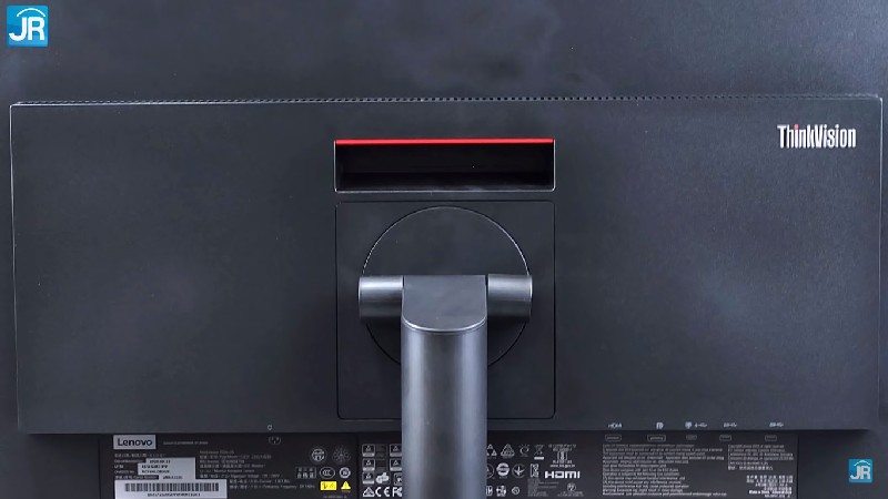 Lalu di sisi belakang monitor terdapat logo ThinkVision dan Lenovo dan juga terdapat sebuah lubang dengan aksen warna merah di tengah dekat penyangga monitor. Lubang ini berfungsi sebagai hand carry yang memudahkan pengguna untuk mengangkat atau memindahkan monitor.