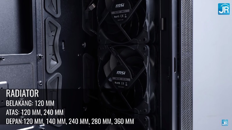 - Kipas bawaan paket penjualan: 4x 120 mm kipas ARGB (1 terpasang di area belakang casing, 3 terpasang di area depan casing)