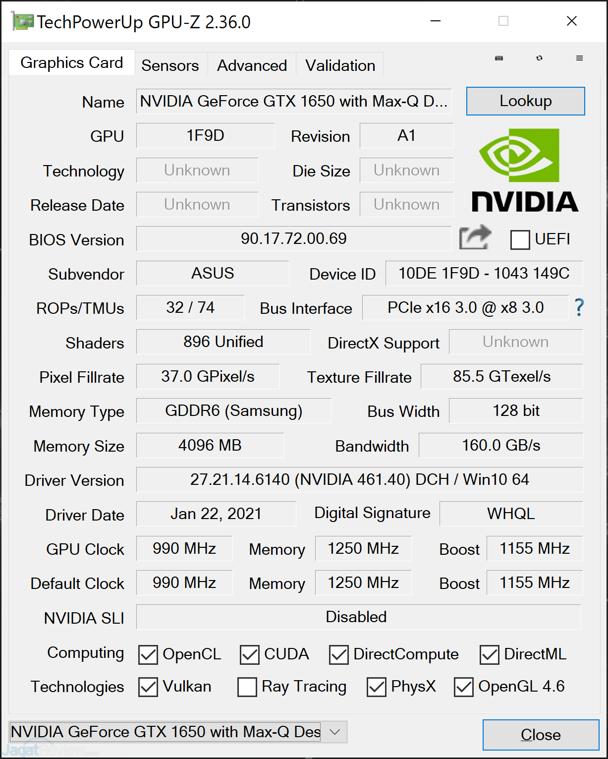 GTX 1650 Max-Q di ROG FLOW X13 memiliki 896 Shader unit, dan juga framebuffer (Video RAM) sebesar 4GB dengan tipe GDDR6. Nvidia memberikan rating core boost clock hingga 1155Mhz (walaupun ini BUKAN clock sebenarnya pada kebanyakan game, kami mencatat bahwa unit ini sering mencapai clock sekitar 1300Mhz ke atas), dengan Memory Clock 1250Mhz (efektif 10Gbps GDDR6).