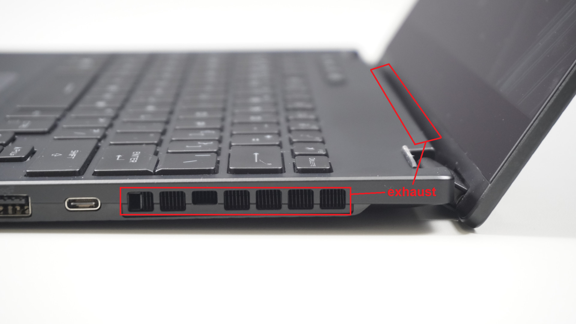 Laptop ini termasuk panas pada zona tengah keyboard dan bagian atas keyboard (dan terlihat sekali zona di depan exhaust semuanya panas, di atas 55C).