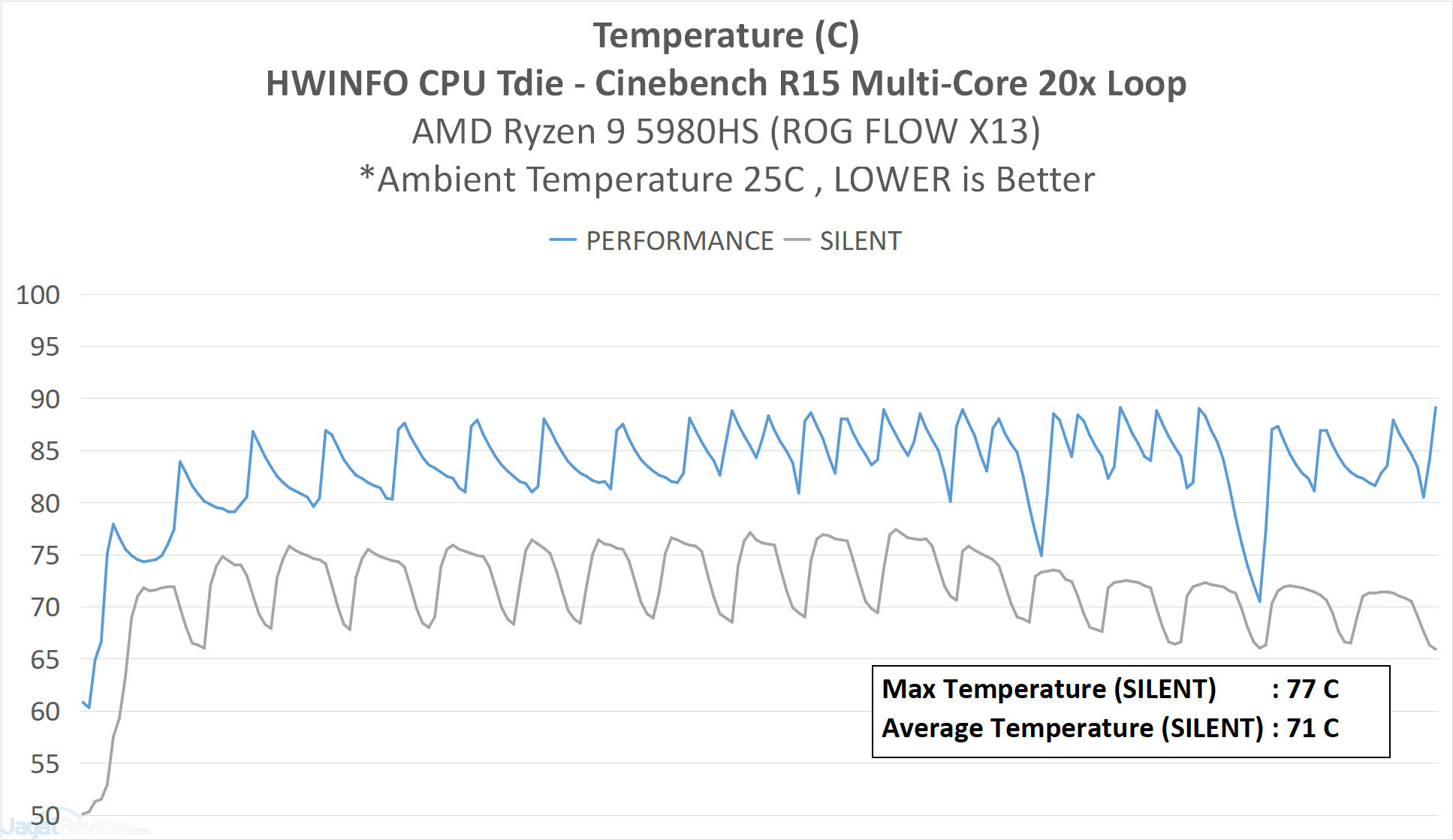Sebaliknya, di Mode Silent, suhu cukup baik terjaga pada Max 77C, dan rata-rata di 71C, meskipun unit diposisikan pada mode Laptop.
