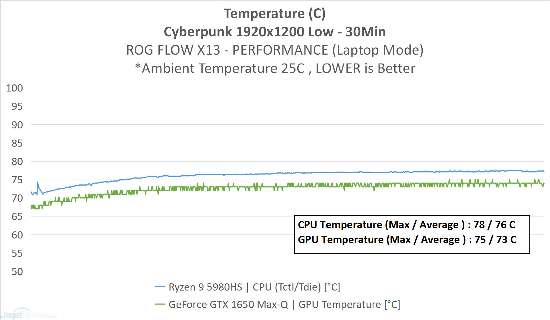 Load seperti Cyberpunk 2077 jauh lebih ringan dari load CPU seperti Cinebench, dimana pada pengujian ini baik CPU dan GPU kami tidak pernah menyentuh angka 80 C.