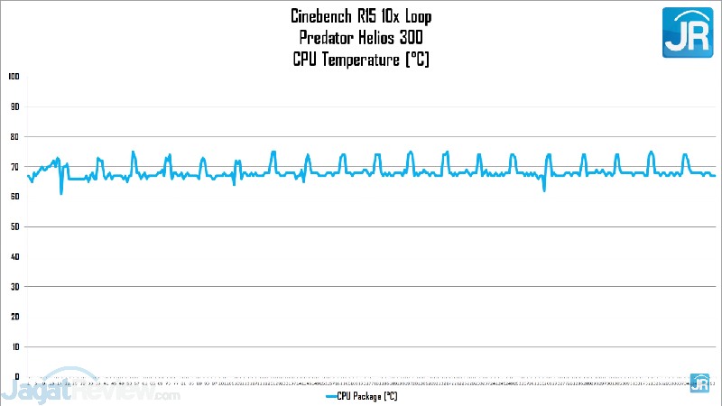 - CPU sempat spike ke 85 saat awal run, kemudian stabil di kisaran 63-65 derajat Celcius