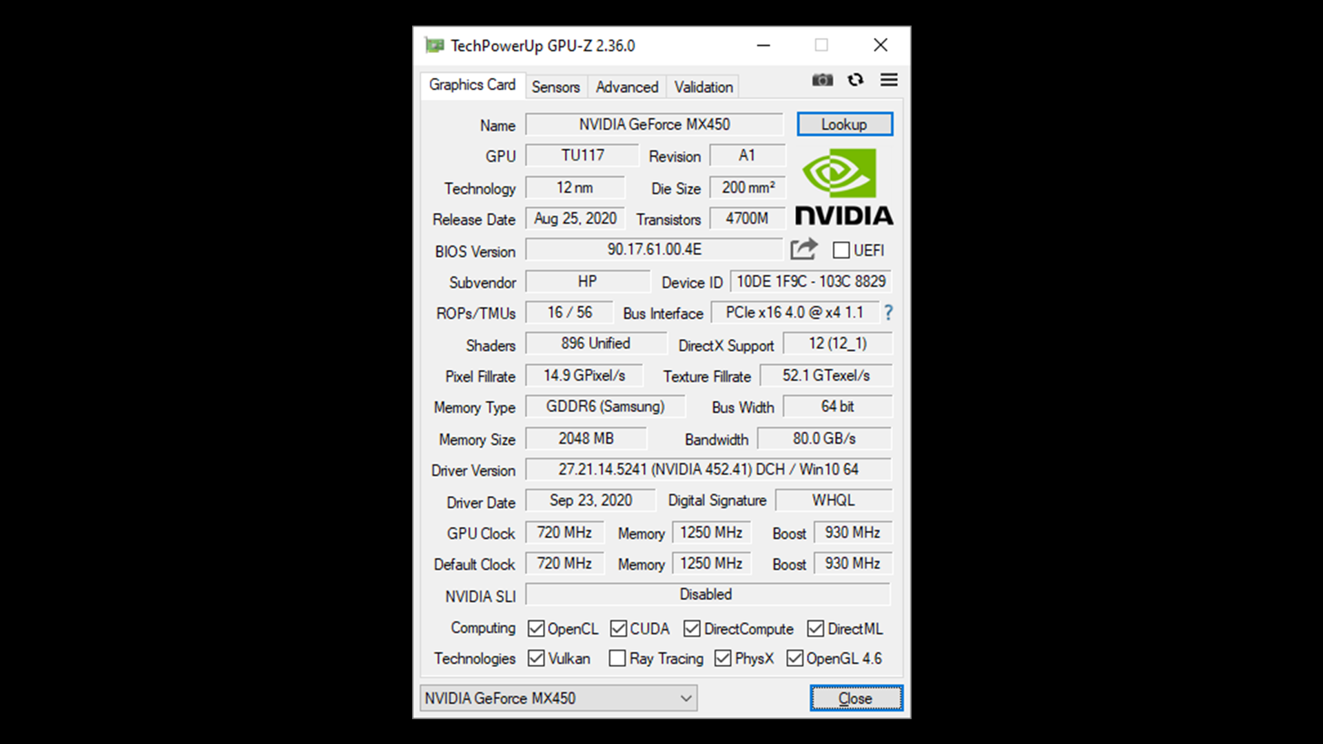 MX450 memiliki Base Clock 720 MHz dengan Boost Clock 930 MHz. Versi yang kami uji kali ini punya Clock lebih rendah dibandingkan yang kami uji sebelumnya di HP Pavilion. Tampaknya HP Envy ini menggunakan versi yang Low Power yang memang cocok untuk Laptop dengan bodi tipis.