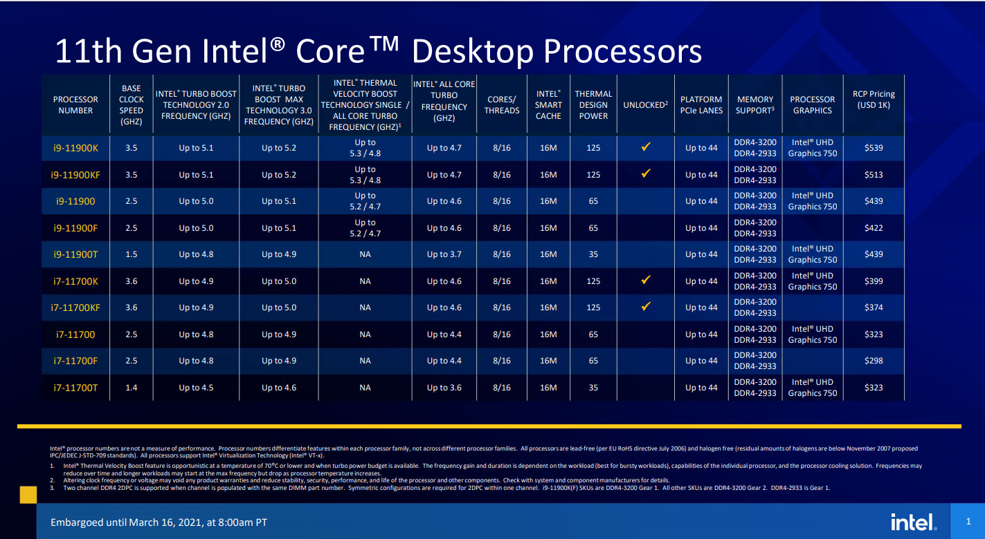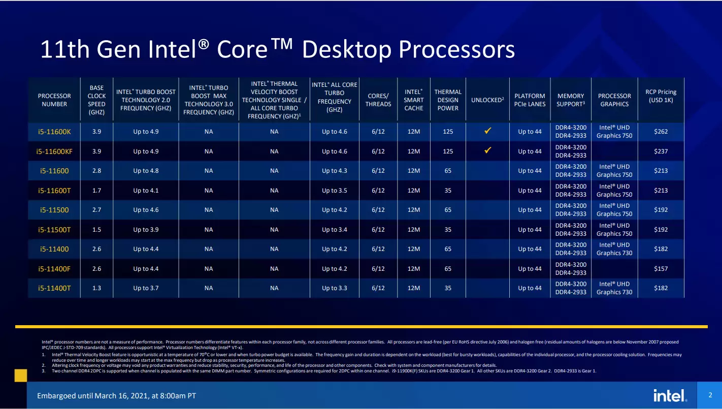 Berikut lineup produk Rocket Lake, berikut dengan recommended customer pricing(RCP)-nya (Catatan: RCP hanya indikasi kisaran harga, harga lokal prosesor tersebut bisa berbeda bergantung banyak faktor)