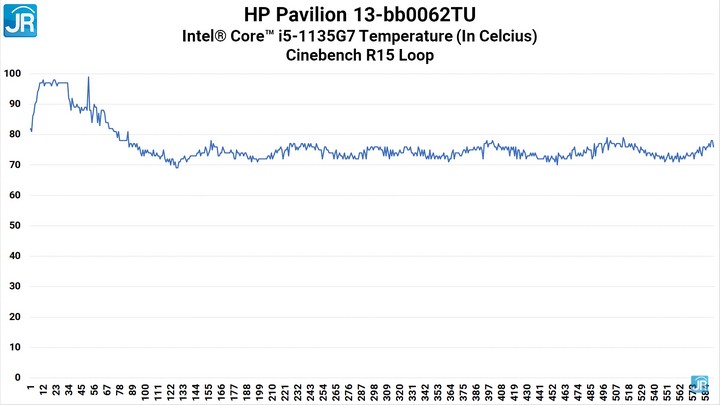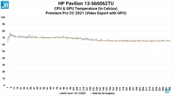 - Di setengah durasi pengujian, suhu CPU dan GPU Iris Xe Graphics sempat berada dikisaran 70-75 °C lalu kemudian mengalami penurunan ke kisaran 65-70 °C