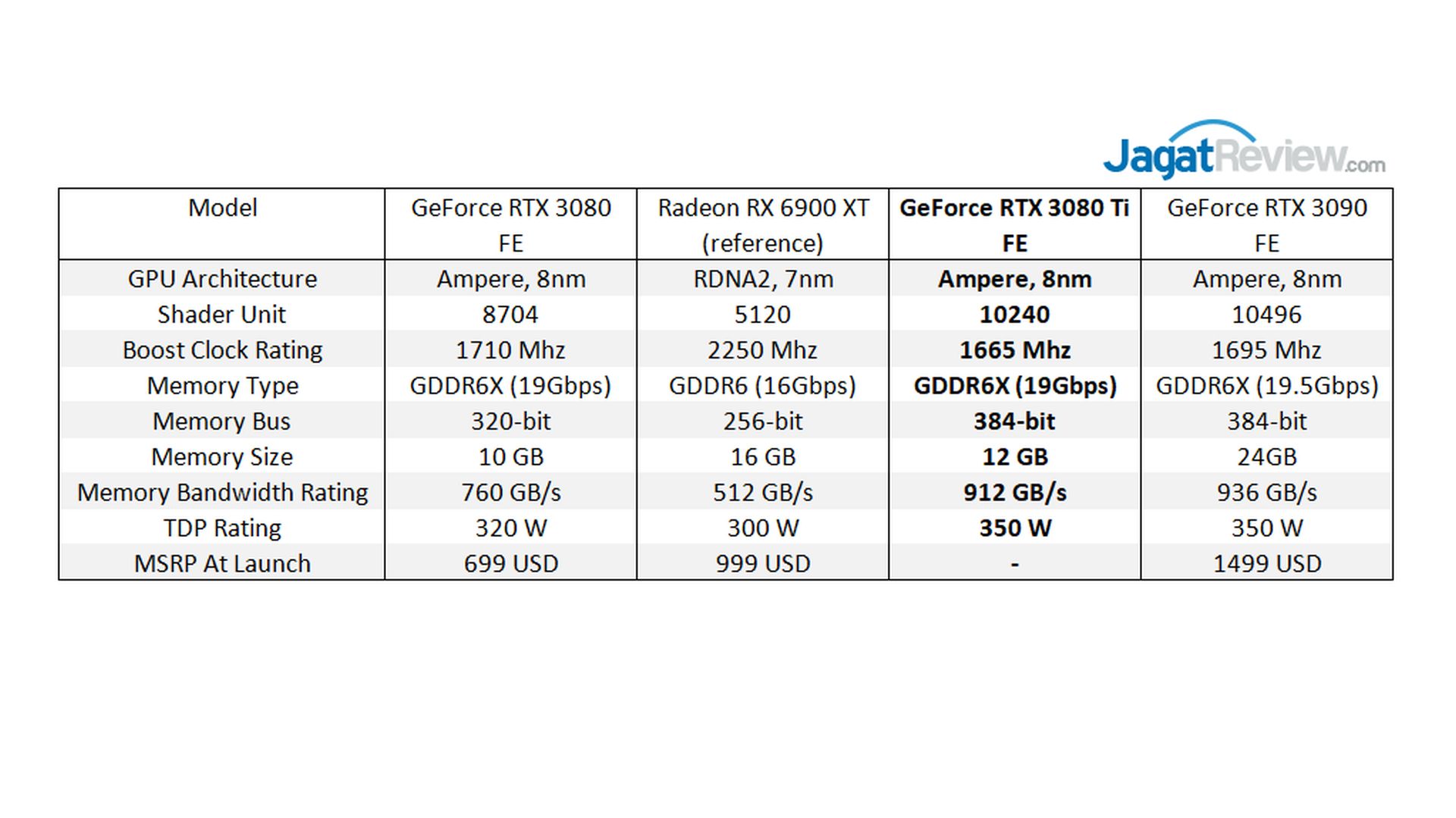 Memory bus width dari VRAM 3080 Ti setara dengan 3090 yakni 384-bit, hanya saja rating GDDR6X-nya lebih kecil.