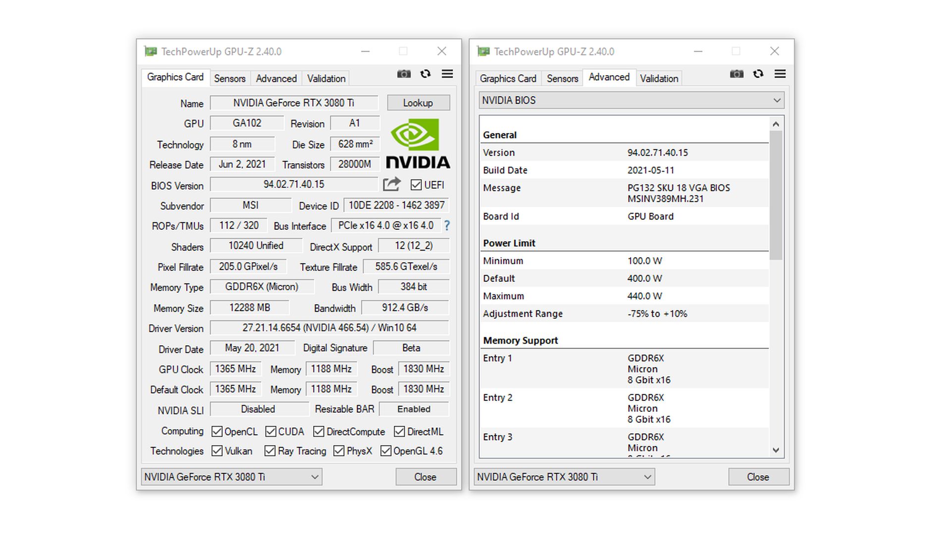 MSI 3080 Ti SUPRIM X memiliki rated TDP di 400W, lebih tinggi dari NVIDIA FE, ini berpotensi memberikan sustained clock lebih tinggi dari FE saat heavy load.