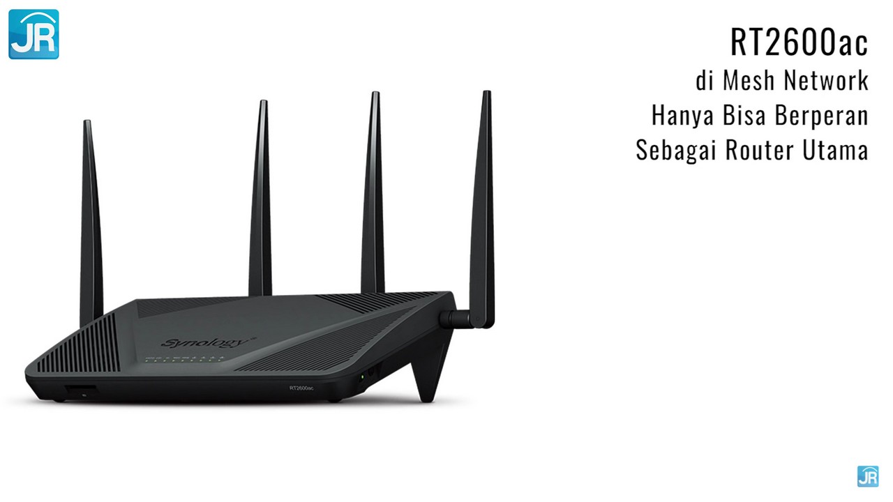 - RT2600ac, di sebuah mesh network, hanya bisa berfungsi sebagai main router saja. Jadi ini hanya bisa jadi pusat sebuah mesh network berbasis Synology Router.