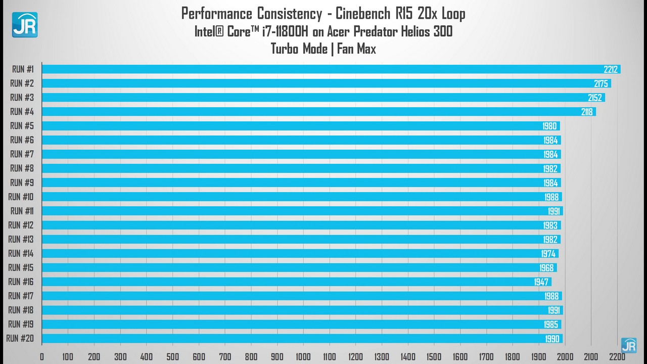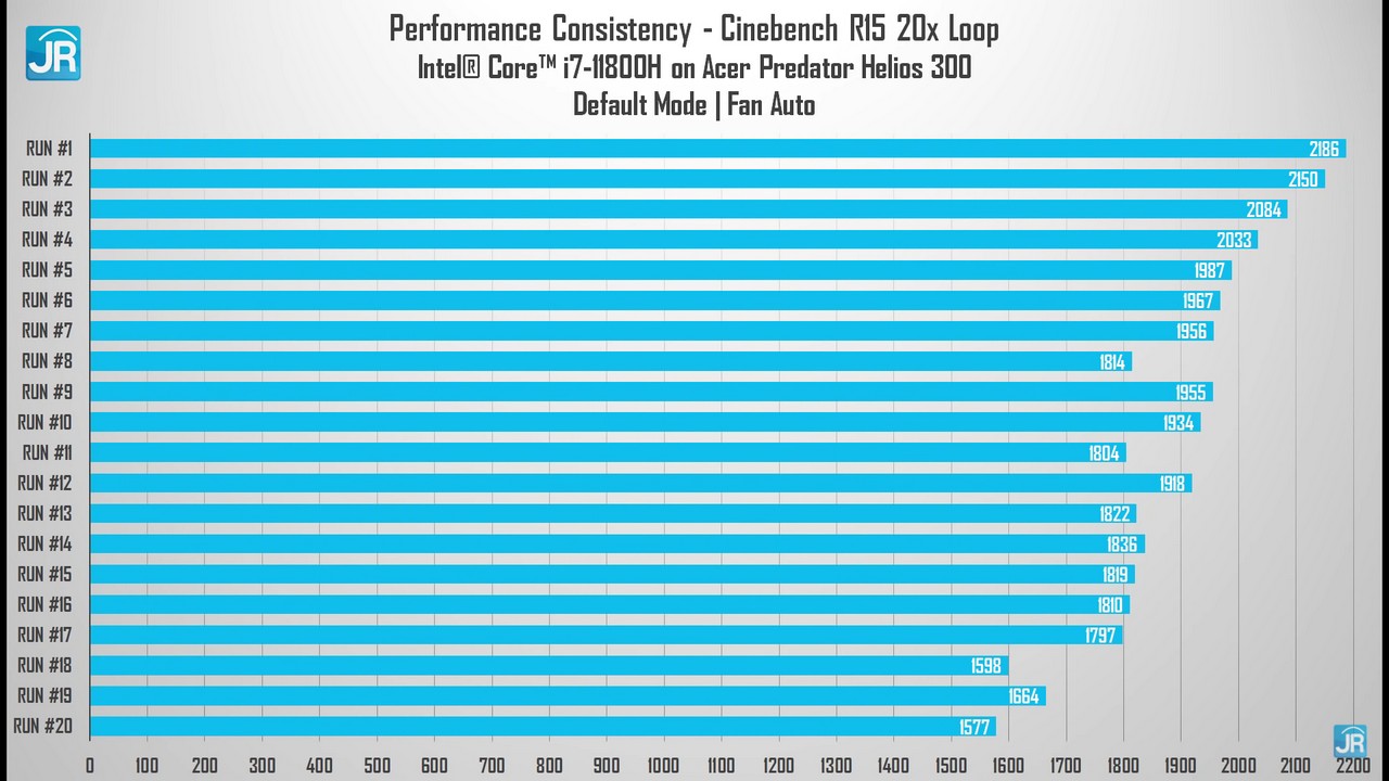- Pada mode default, prosesor Intel Core i7-11800H pada Acer Predator Helios 300 mampu mencapai skor tertinggi di 2186 poin