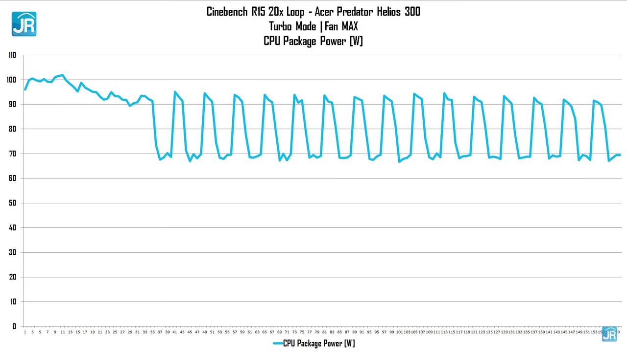 - Setelah kami cek, di mode Turbo terlihat bahwa Acer Predator Helios 300 memiliki CPU Package Power di 100W saat awal run, dan beberapa kali menyentuh 95W di tiap awal run selanjutnya.