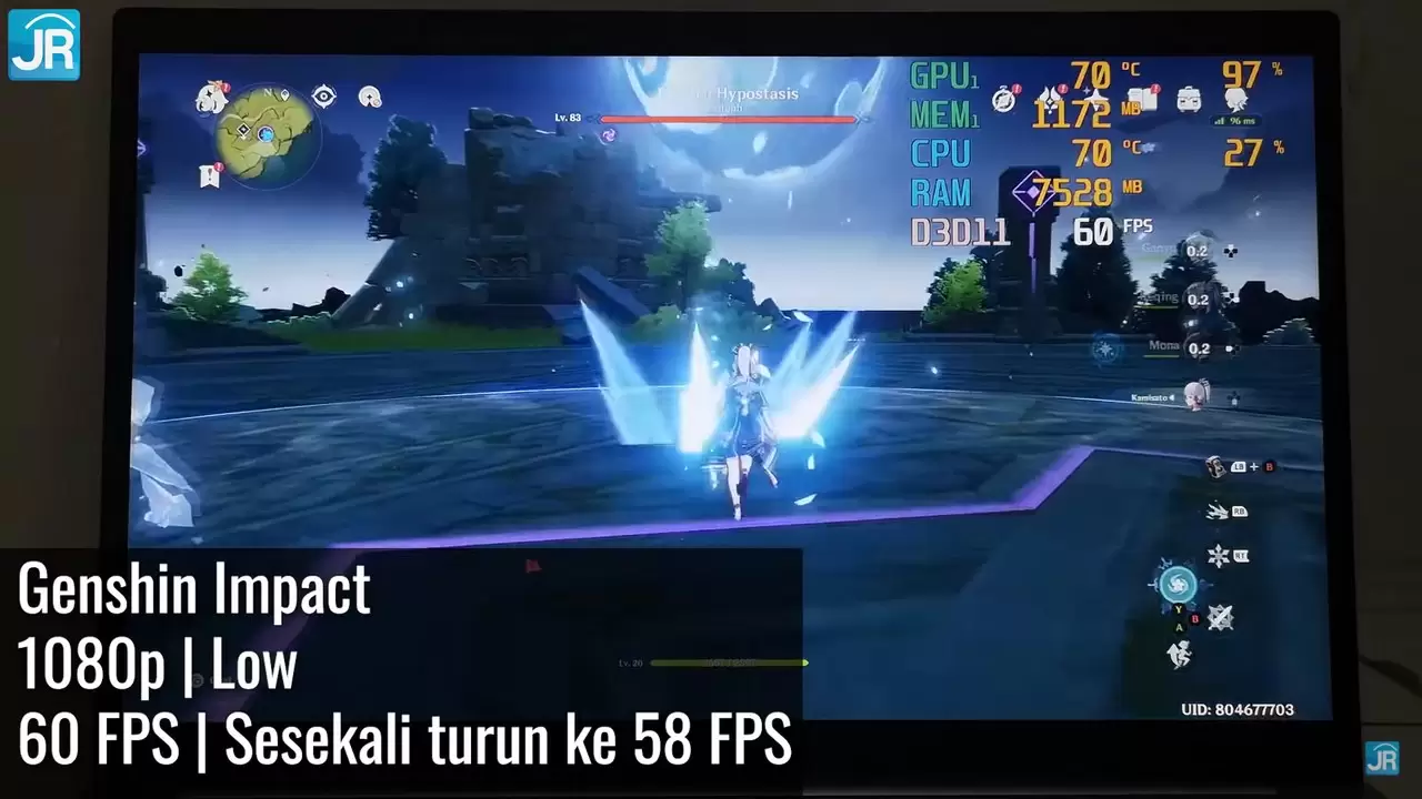 - Sesekali turun ke 58 fps saat banyak efek visual yang muncul di layar, tapi rata-ratanya di 60 fps