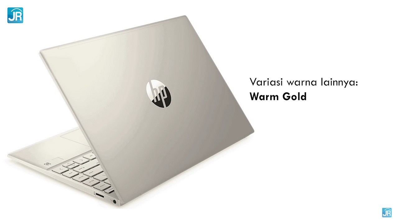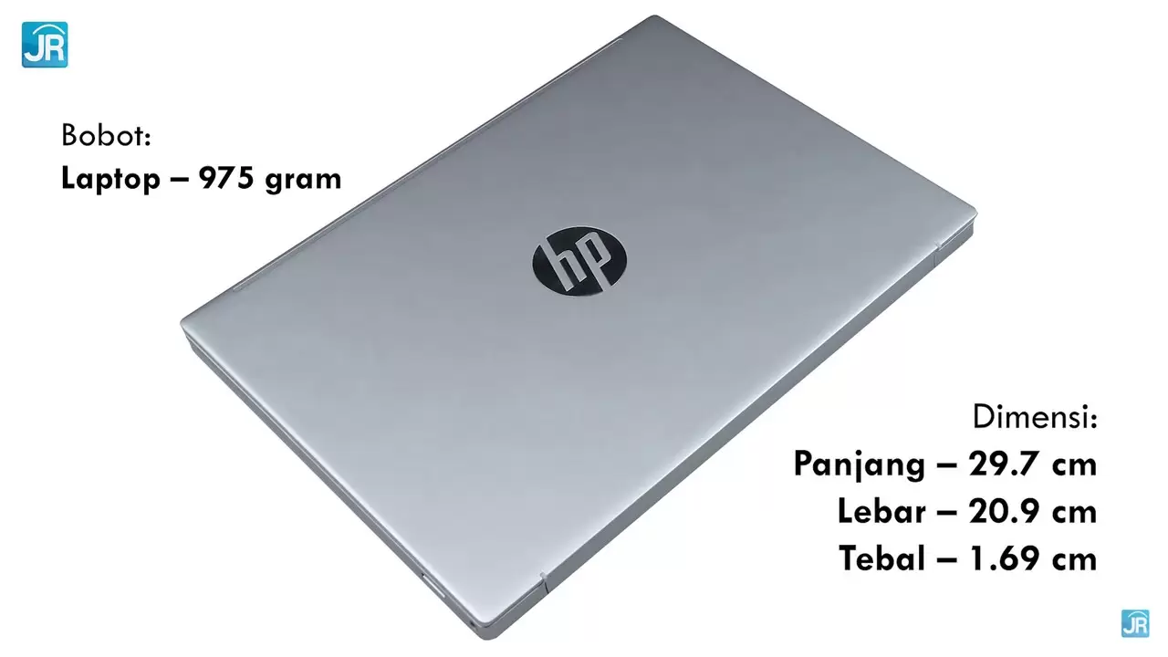 Terdapat logo HP di bagian belakang layar. Warna yang ditawarkan yaitu Natural Silver disamping warna lain yang tersedia yaitu yakni Warm Gold. Untuk ukuran dimensinya, laptop ini memiliki panjang 29.7 Cm, Lebar 20.9 Cm, dan Tebal 1,69 Cm.