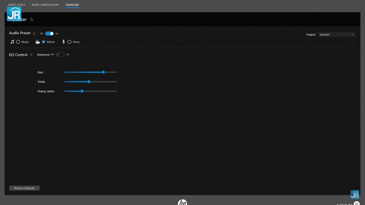 Di sisi audio, laptop ini mengandalkan 2 Speaker Stereo by Bang and Olufsen, yang terletak di bagian bawah kanan-kiri laptop. Terdapat software B&O Audio untuk mengubah preset audio. Kualitas suara yang ditawarkan cukup jernih dan lantang.