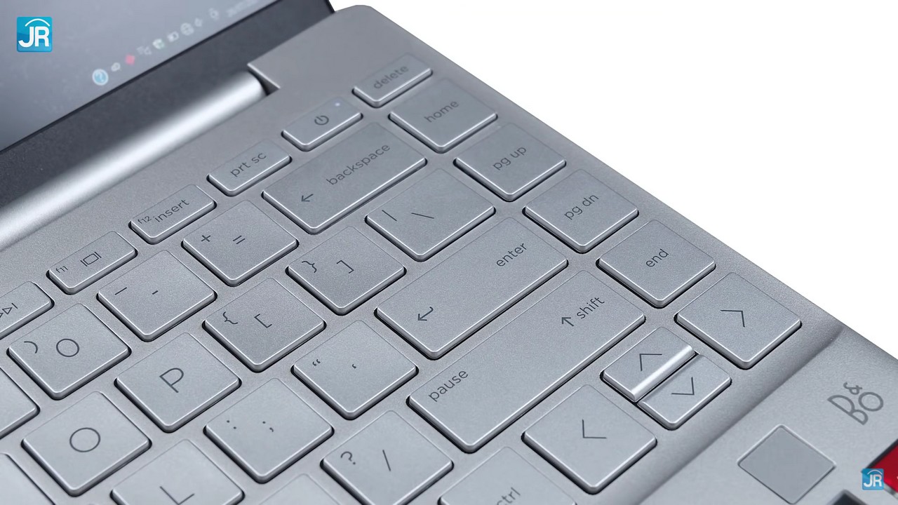 Beralih ke keyboard, laptop ini menggunakan keyboard chiclet dengan layout khas HP. Keyboard ini terasa nyaman saat digunakan mengetik. Di sisi kanan ada tombol navigasi (page up/page down dll). Tombol power menyatu dengan layout keyboard, dimana Posisinya bukan di pojok kanan atas/tombol delete, melainkan di sebelahnya.Terdapat backlit putih dengan 2 tingkat kecerahan.