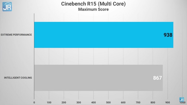 - Skor tertinggi Core i7 1165G7 di Laptop ini tampak mampu mencapai 867 poin di mode Intelligent Cooling dan dapat naik ke 938 poin di mode Extreme Performance.