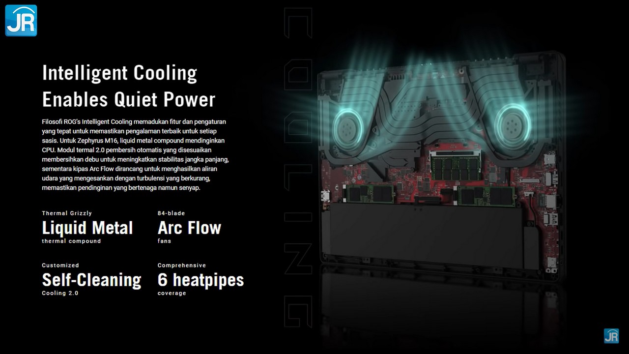 - 6 heatpipe dengan heatsink yang menutupi seluruh komponen CPU, GPU, VRAM, VRM dan Chipset