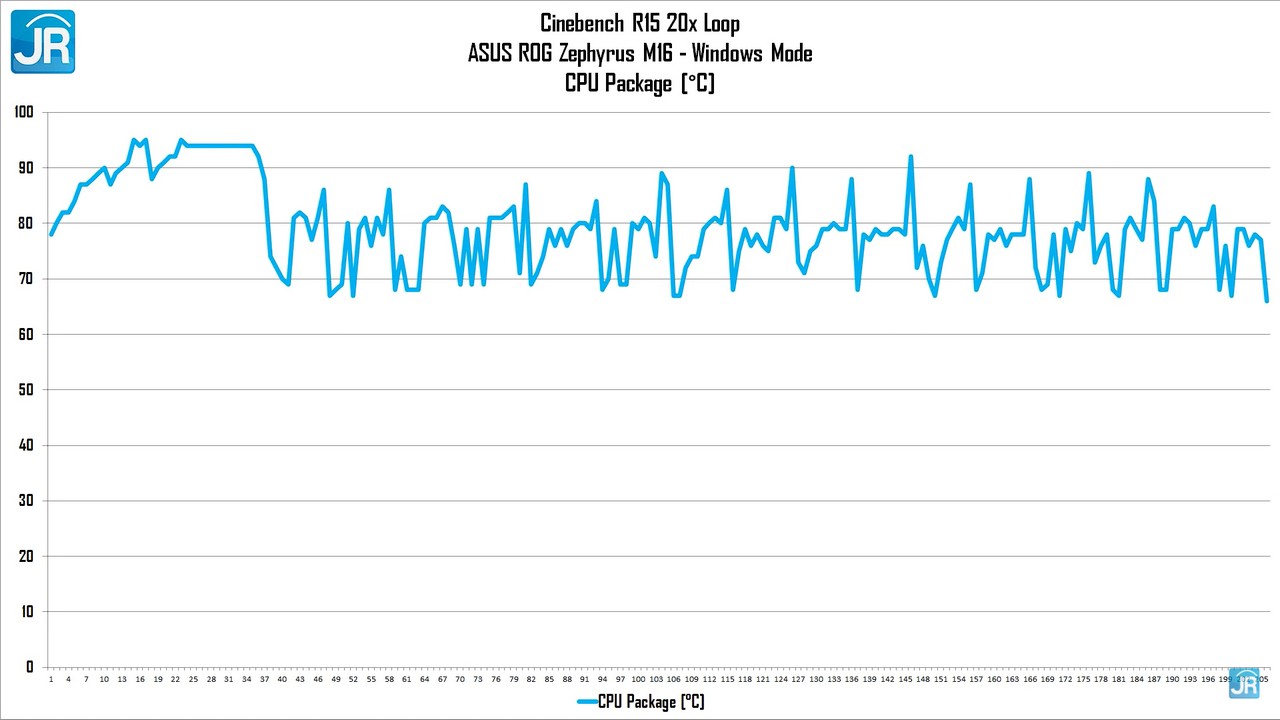 - Sedangkan di mode Windows, suhu 94-95 derajat Celcius hanya terlihat di tiga run pertama saja.