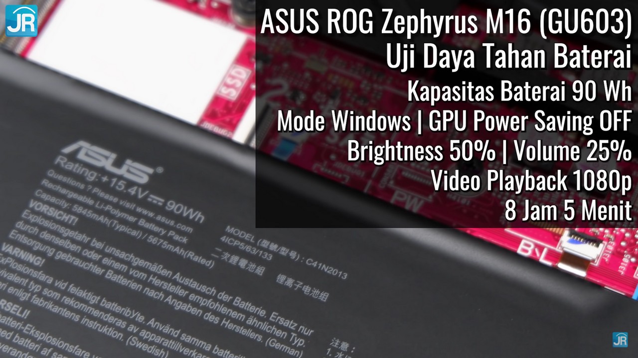 Laptop ini memiliki baterai berkapasitas 90 Wh. Pada pengujian review ROG Zephyrus M16, kami menggunakan Mode Windows, dengan GPU Power Saving OFF (Kondisi Default-nya), serta layar dengan Brightness 50% dan Volume 25%. Hasilnya adalah sebagai berikut.