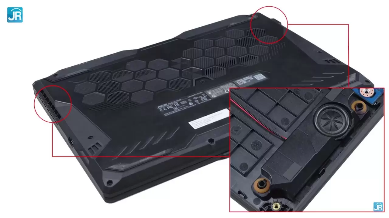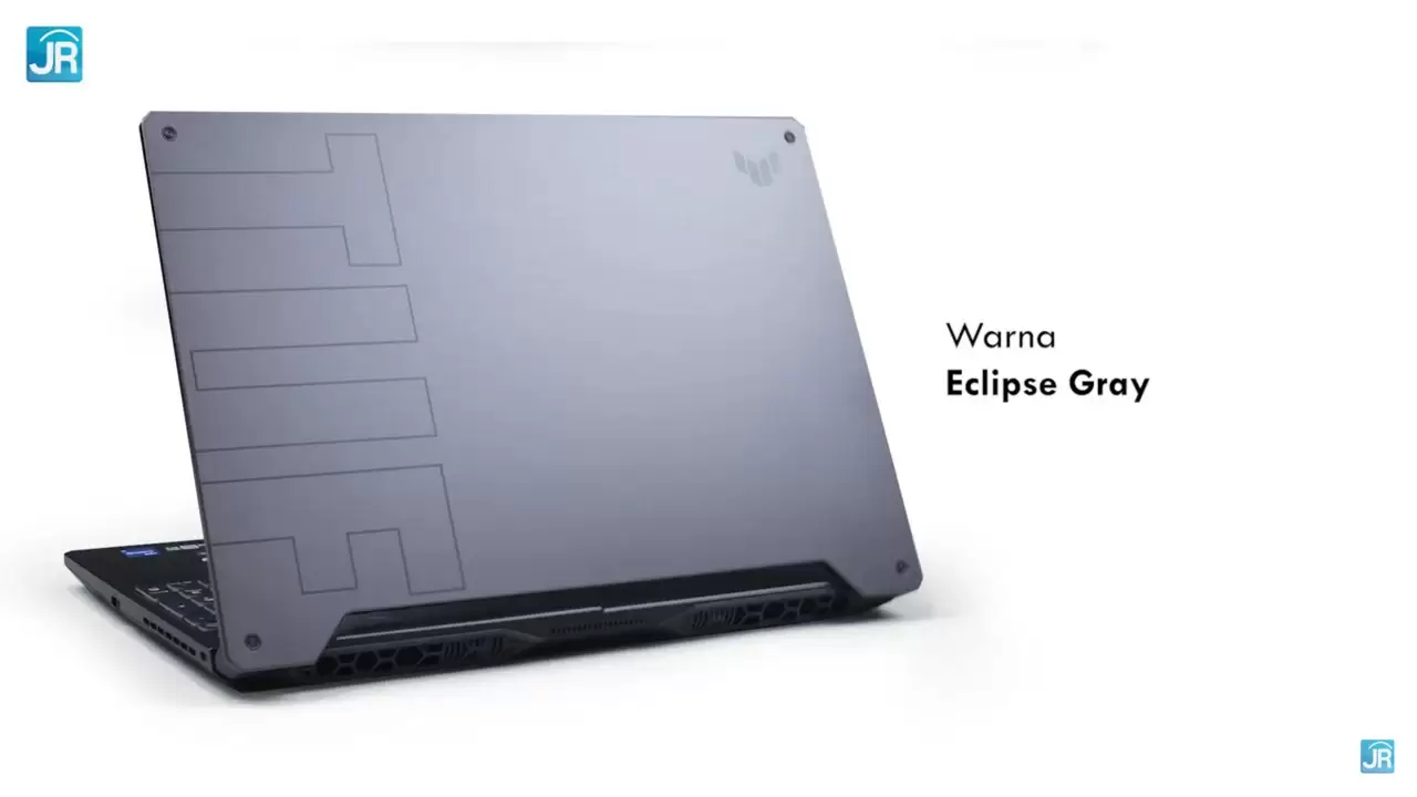 Di bagian belakang layar terdapat logo TUF yang baru di pojok kanan atas, dengan tulisan TUF yang berukuran besar pada sisi pinggir kiri. Logo baru TUF “The Badge”, disebut ASUS memiliki filosofi yang melambangkan jiwa petualang muda dan ketangguhan. Warna yang ditampilkan yaitu Eclipse Gray, yang terlihat simpel tapi tetap elegan.
