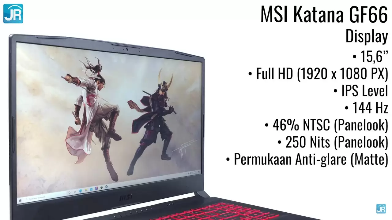 Beralih ke Display, laptop ini memiliki layar berukuran 15.6 inci dengan resolusi Full HD (1920 x 1080p), dengan panel IPS-Level. Layar memiliki refresh rate yang cukup untuk dikatakan sebuah laptop gaming, yaitu 144 Hz.
