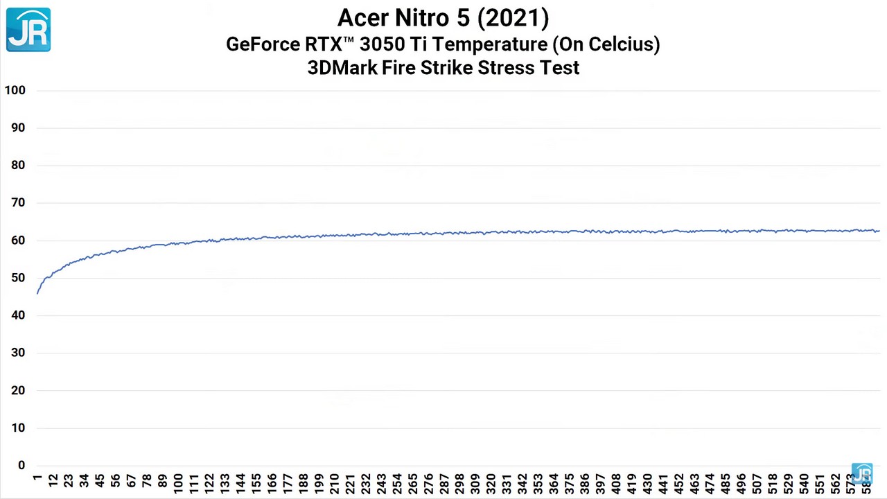 - GeForce RTX 3050 Ti – Suhu kerja tertinggi yang dicapai hanya berkisar 62-63 °C