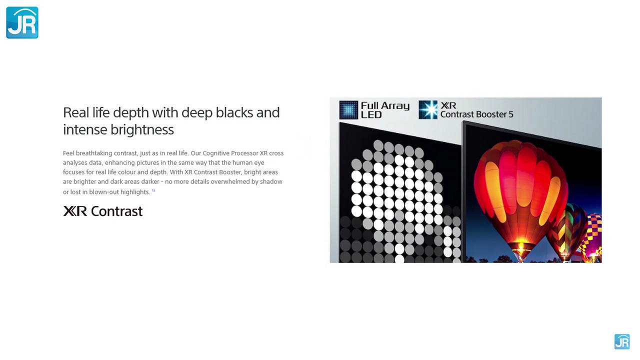 - XR Contrast; Mengatur gelap-terangnya tampilan di sehingga tidak ada area tampilan yang terlihat washed-out atau blown-out. Ini juga didukung oleh Local Dimming dan fitur XR Contrast Boost 5.